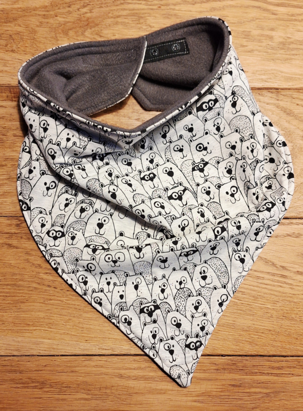Doekje beerDit doekje/ sjaaltje is gemaakt van zachte tricot en dunne fleece, en bedoeld om speeksel op te vangen. De tricot in combinatie met fleece zorgt voor een soort tunneleffect, de fleece laat geen vocht door.