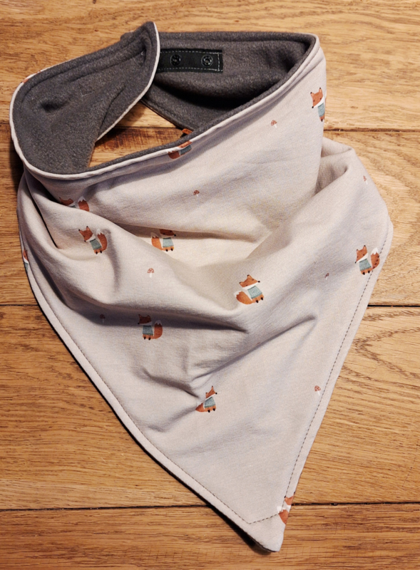 Doekje vosDit doekje/ sjaaltje is gemaakt van zachte tricot en dunne fleece, en bedoeld om speeksel op te vangen. De tricot in combinatie met fleece zorgt voor een soort tunneleffect, de fleece laat geen vocht door.