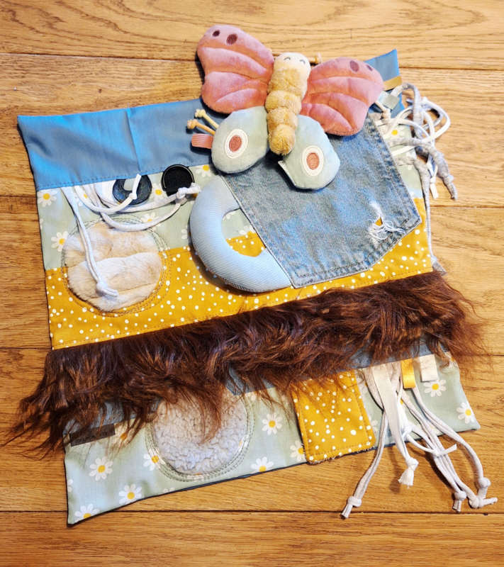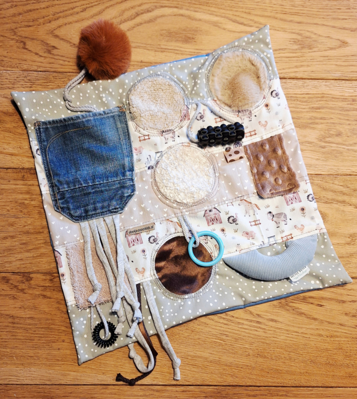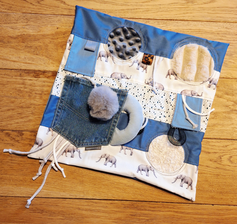 Afmeting: 40x40 cm. Het voelkussen heeft diverse voelelementen om aan te kunnen friemelen.€ 30,00